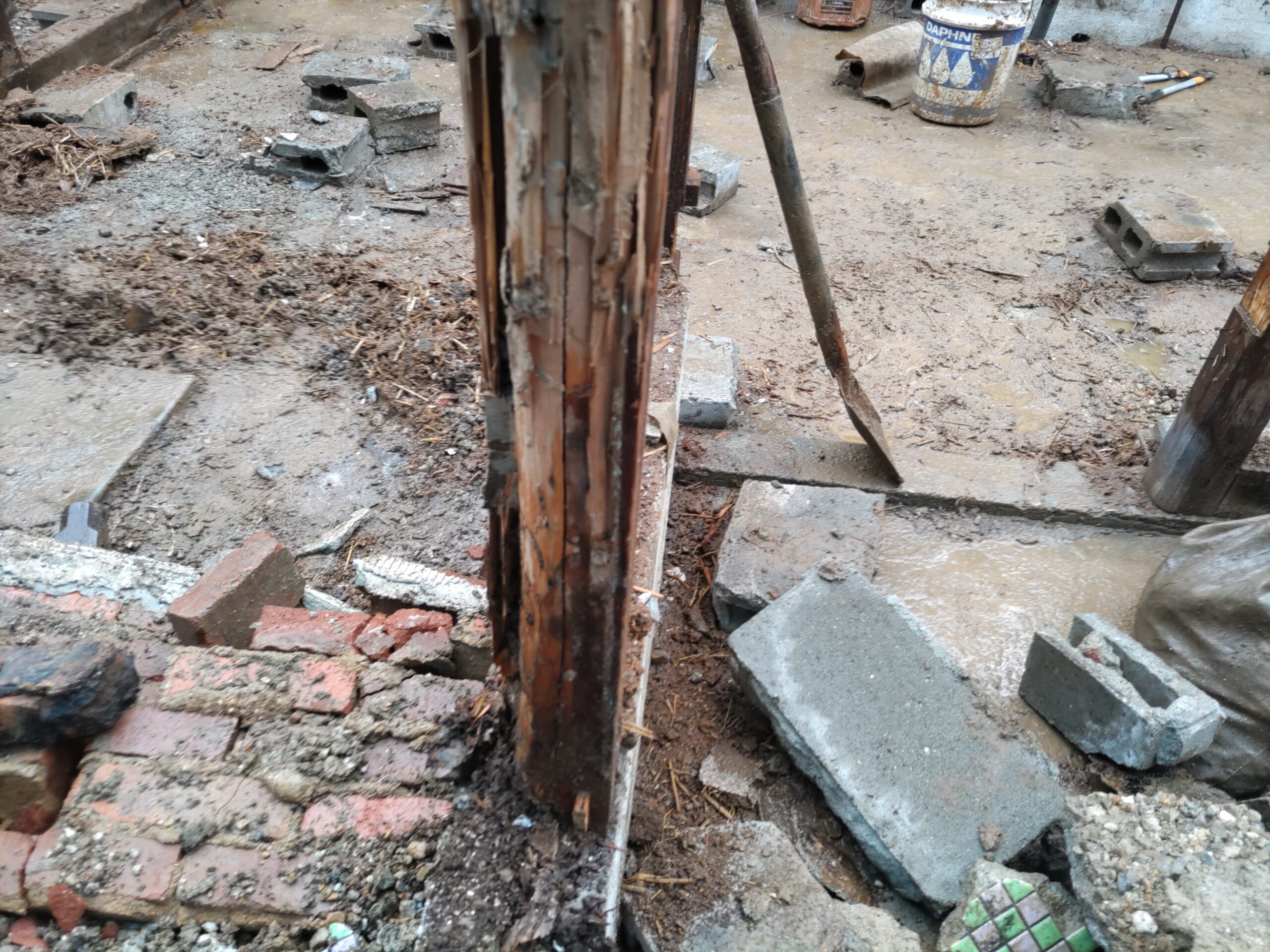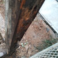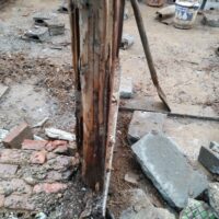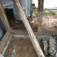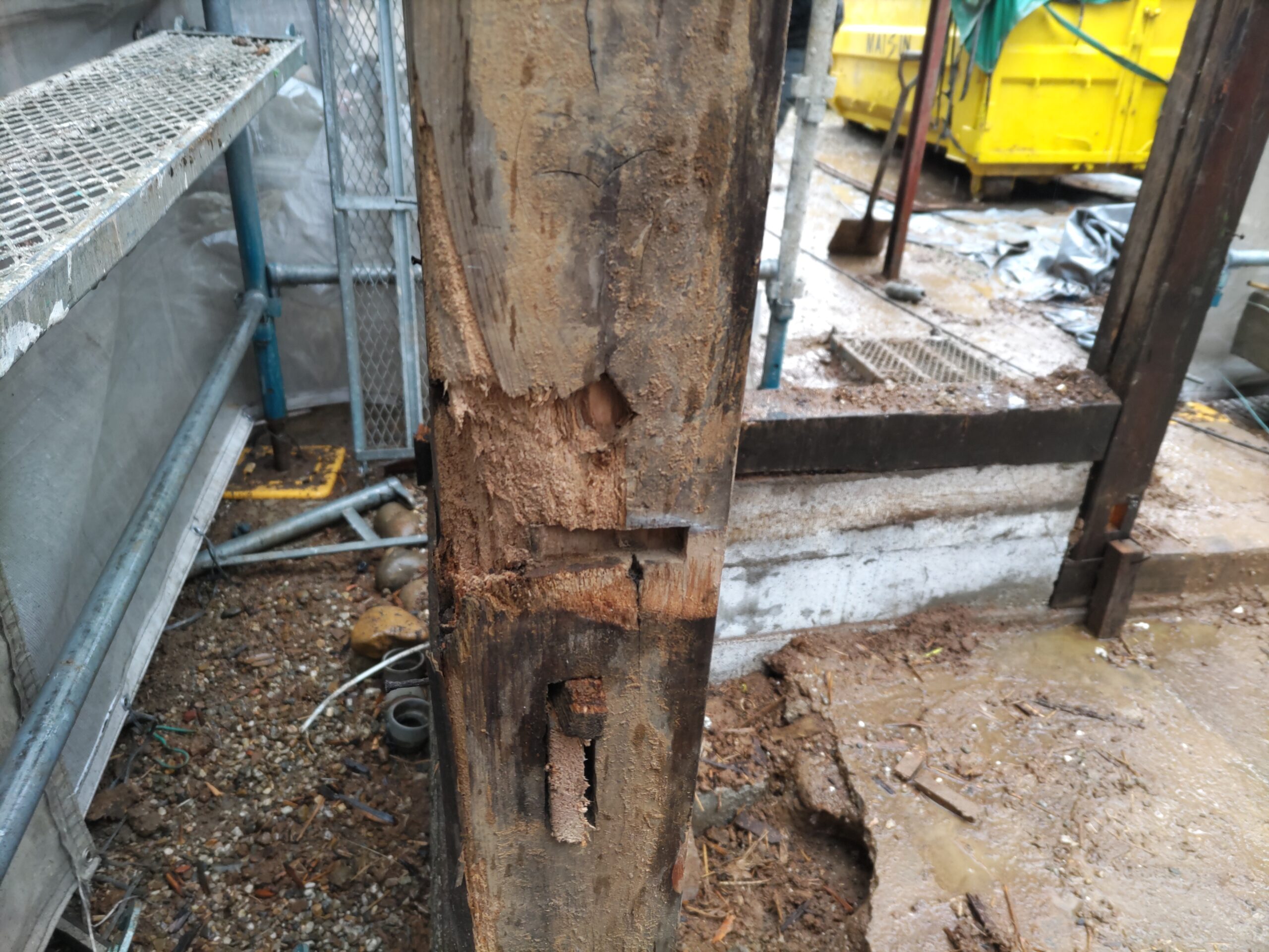 各箇所の柱がだいぶ白蟻に喰われていますので、交換が必要になってきます。取り急ぎ、仮設の段階で倒壊しないように補強をする事になります。