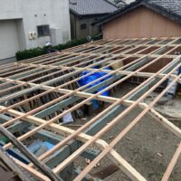 内部造作は間仕切りと天井下地にかかっています。先日ユニットバスも無事に設置完了しています。面積が少ないために造作工事もあっという間にできてきます。