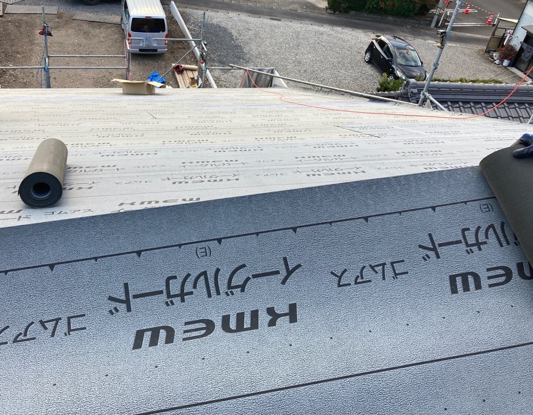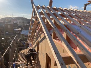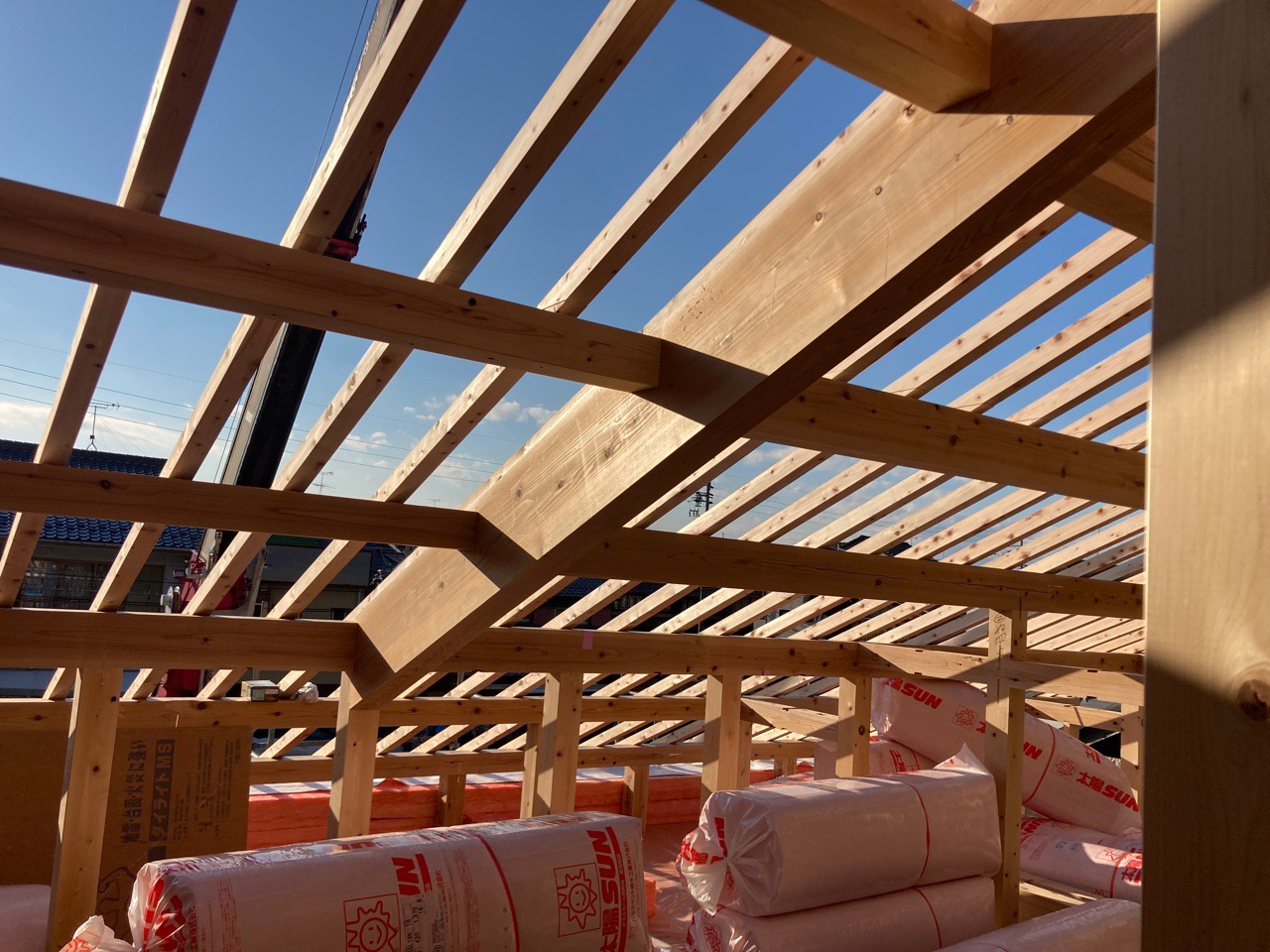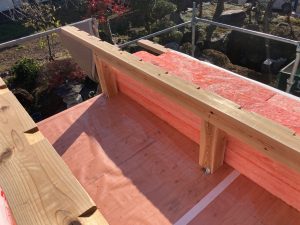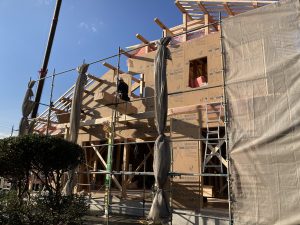 先週末の上棟は、両家のご両親や奥様a様、お子様のsちゃんが見守る中、夕方には目標作業の屋根ルーフィングまで敷かれ滞りなく終えることができました。