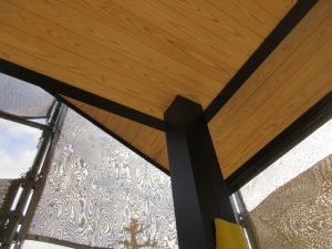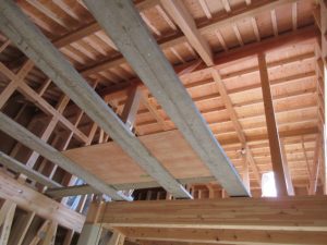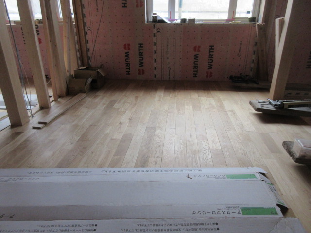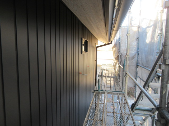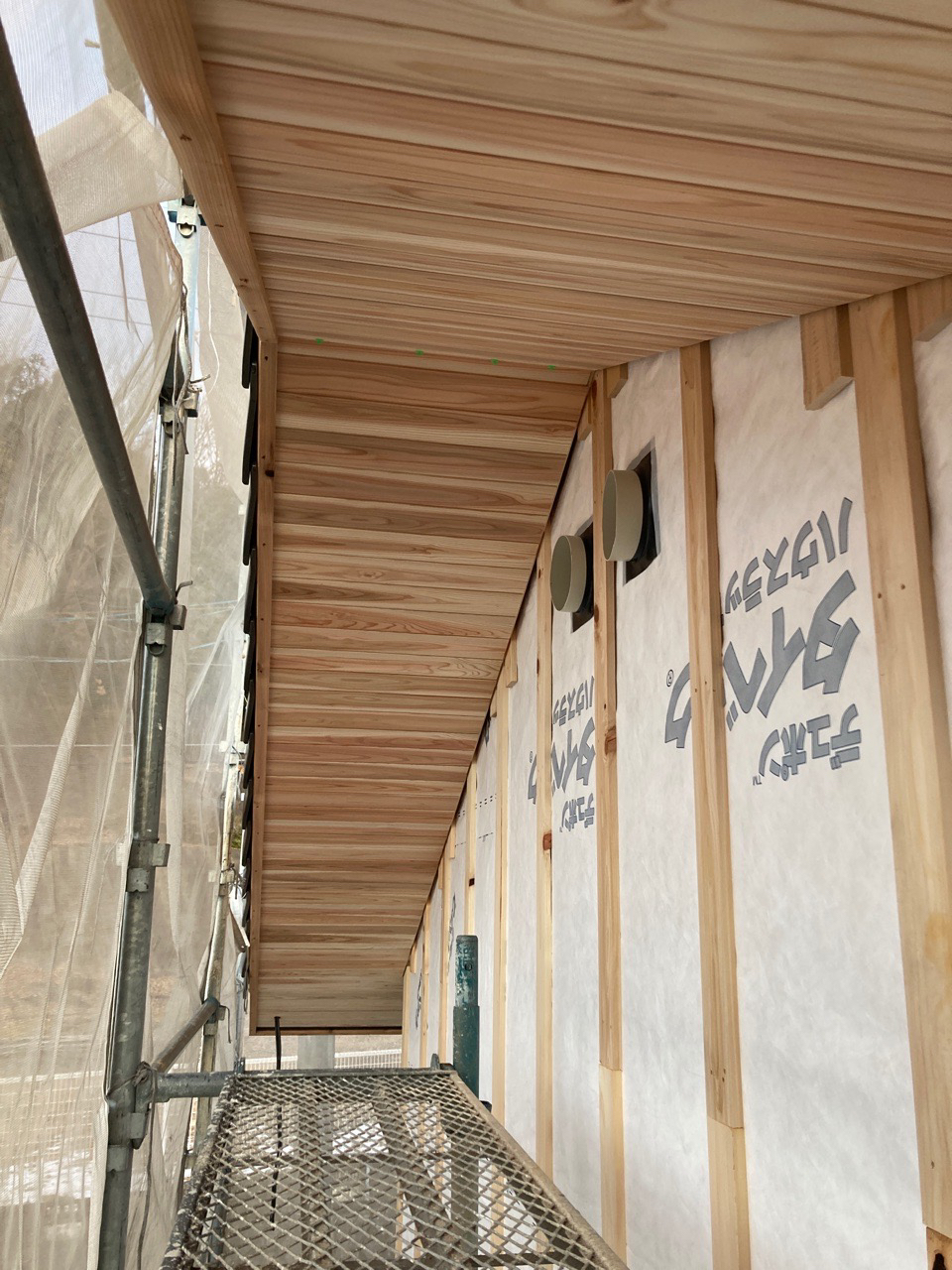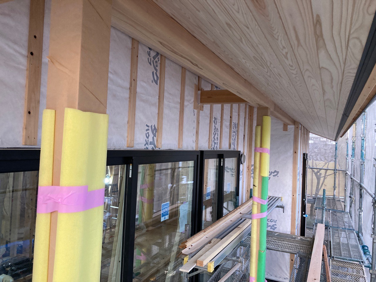 内部は天井下地が進みました。その後床張り施工に進んでいます。ナラ材は傷が付きにくく、耐久性に優れていますが、施工中はしっかり養生されます。軒裏には杉の羽目板が張られています。外壁は黒いガルバリウム鋼鈑の3山が施工されました。