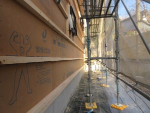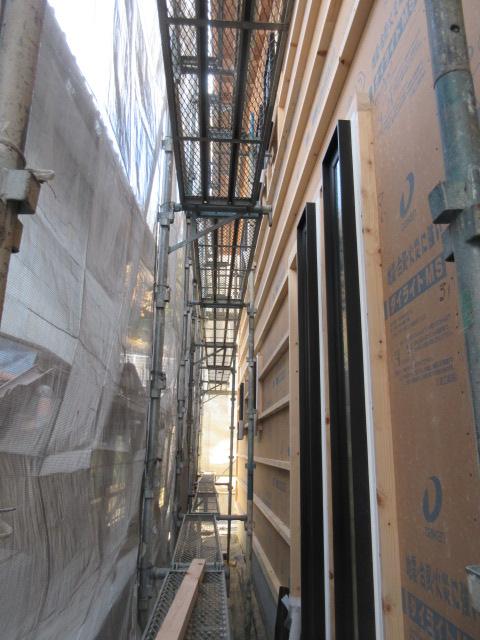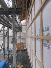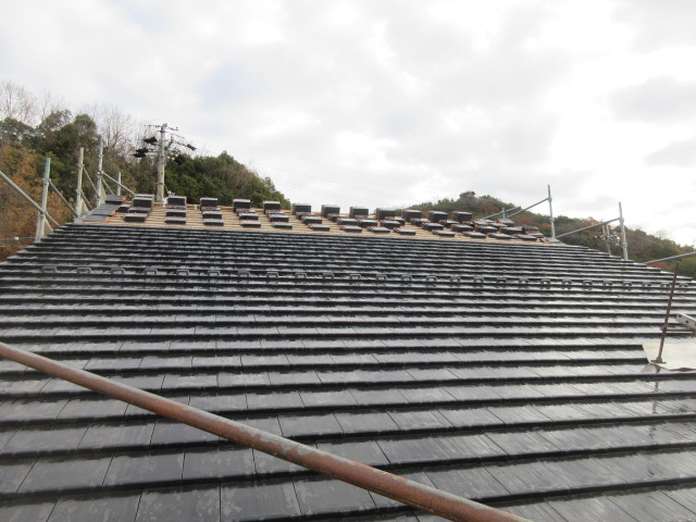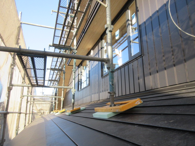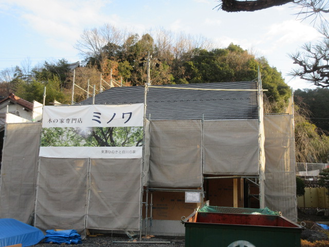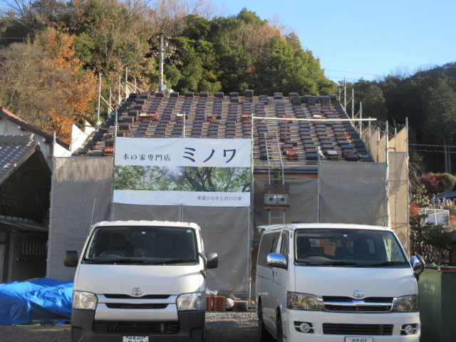 瓦葺き工事完了です。外部は断熱用下地が進んでいます。
