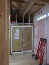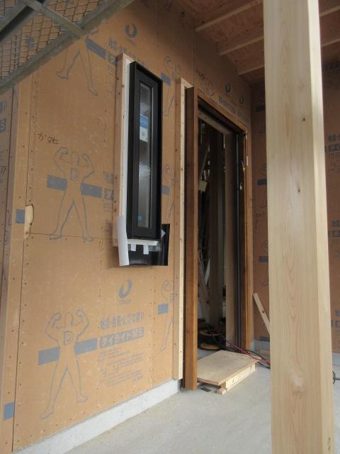 サッシも取り付けられ、屋根の瓦工事が始まりました。CERAM-F FRAT一体袖タイプでとてもすっきりとして見えます。