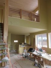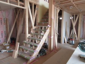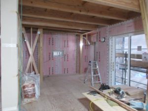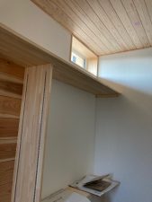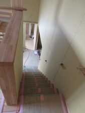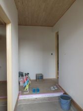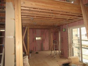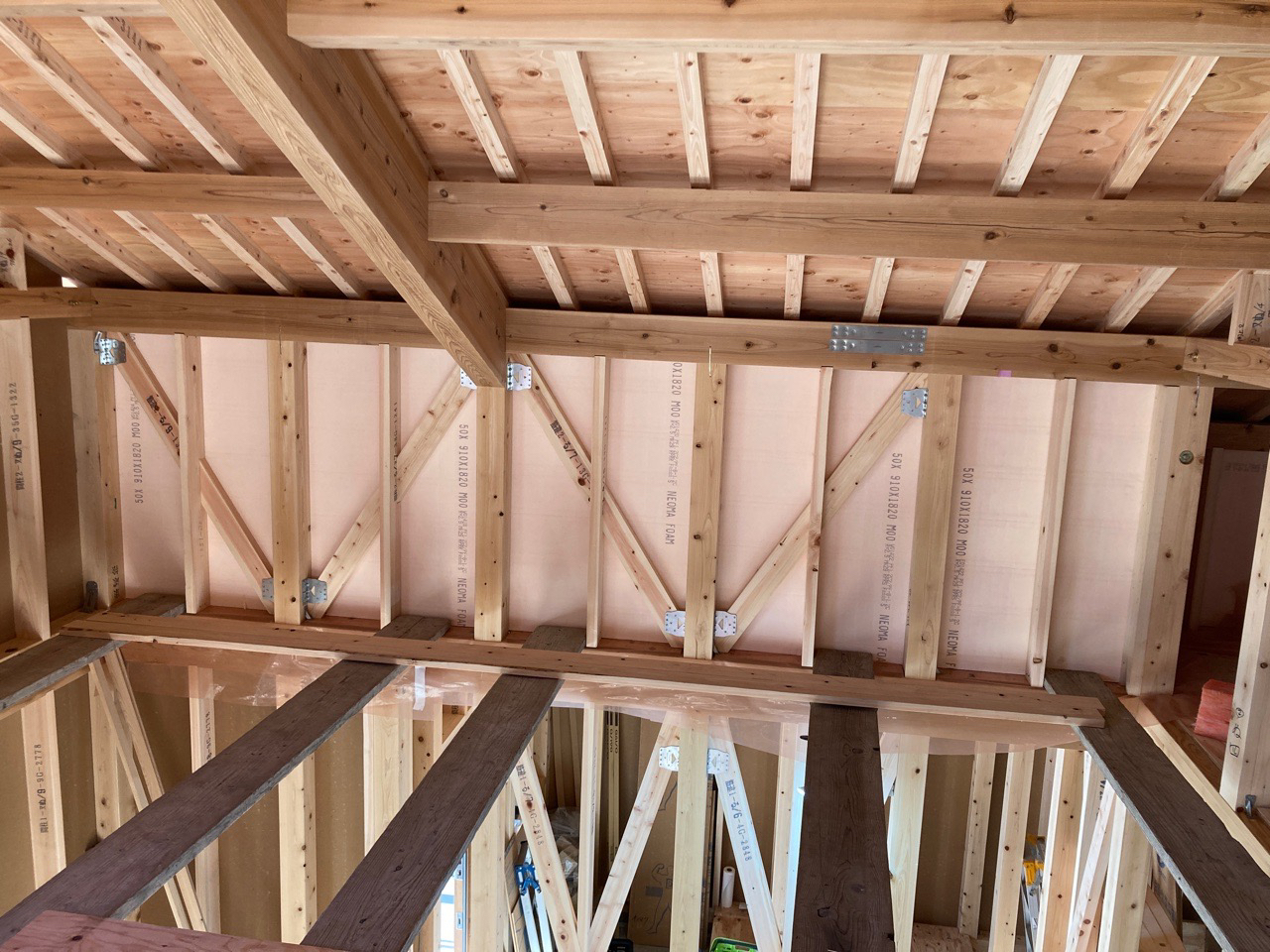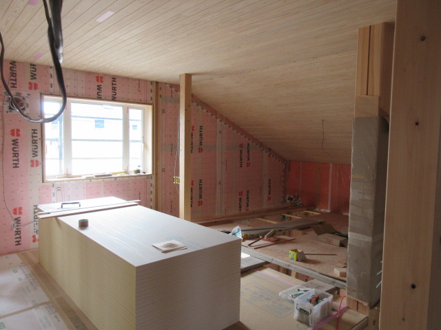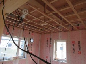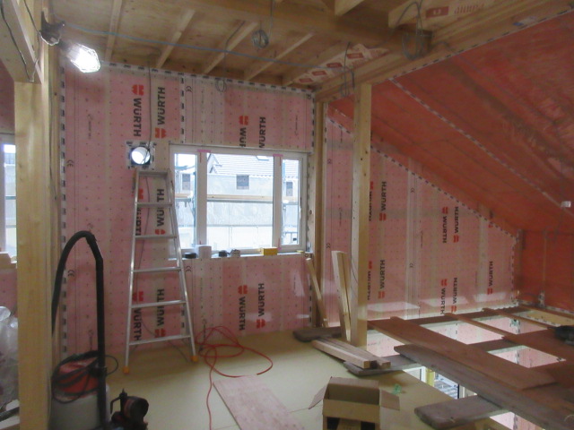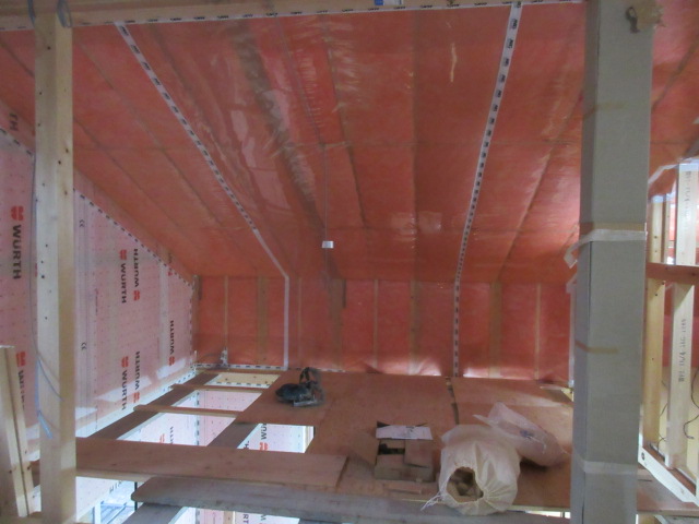 断熱施工後の外壁に通期胴縁と下地胴縁が取り付けられました。室内はユニットバスが設置され、断熱充填が進んでいます。壁には厚み120㎜、屋根断熱は厚み155㎜2段が施されています。勾配天井部分が大きくとられており広々としています。