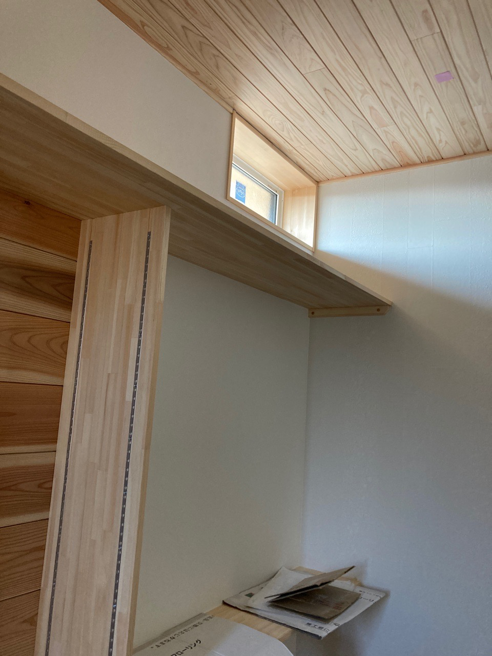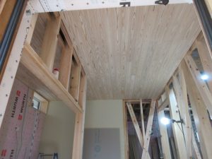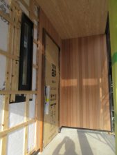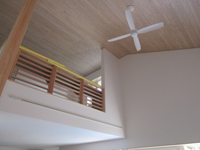 天井に杉板が張られました。リビング内のオープン階段を上がると、6畳ほどある2Fホールへとつながっています。外部は玄関側の壁に杉板が張られました。軒裏部分も杉板ですが、こちらは赤身の強い柾目を使用しており、杢目もすっきりとしています。