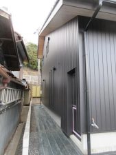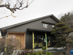 足場が外されすっきりしました。植栽がいい雰囲気を出しています。南が妻側になりますが、独立柱を建てて庇を伸ばし、夏の強い日差しを遮ります。