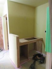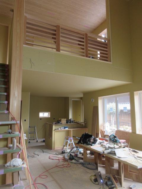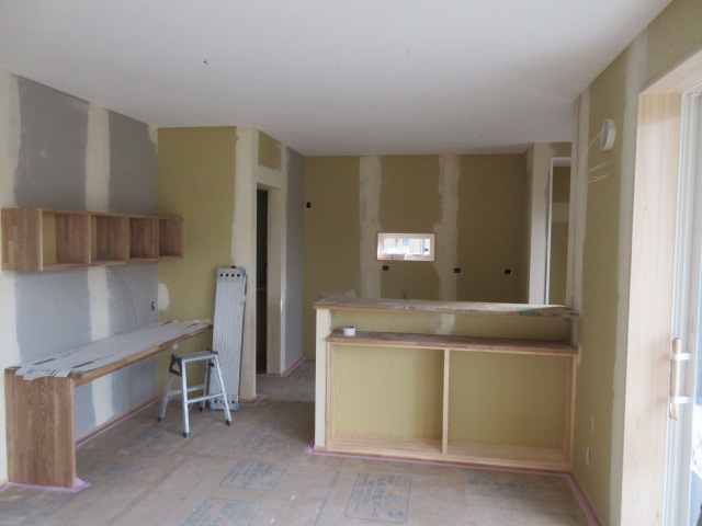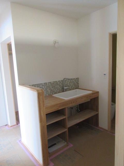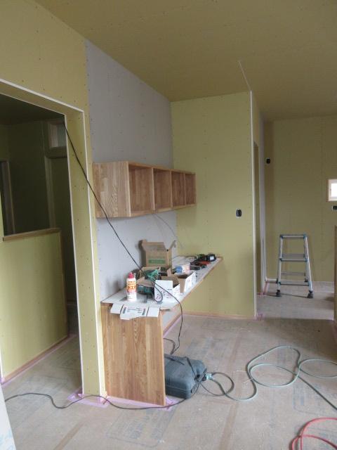 室内は造作工事が進んでいます。穴が空いたカウンターには洗面台が設置されます。幅も広いため収納も程よくでき、朝の込み合う時間帯もストレスフリーですね。LDK内のカンターデスクは目の届くお子様の勉強やPCコーナー、ちょっとした作業できて便利なスペースです。