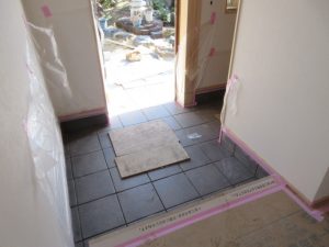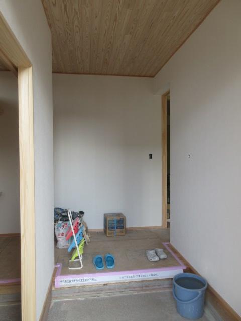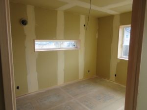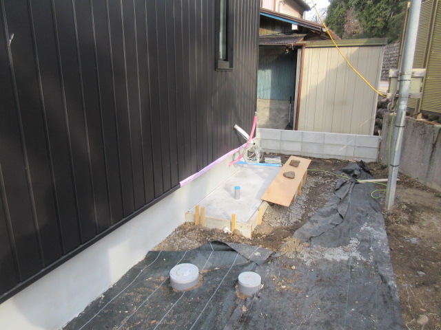 給湯器設置場所・広いウッドデッキが造られる下は、後から手が届かなくなるので除草が大変です。こういった場所は予め土間コンが施されます。室内は壁・天井にパテ処理がされ、クロス工事が進んでいます。